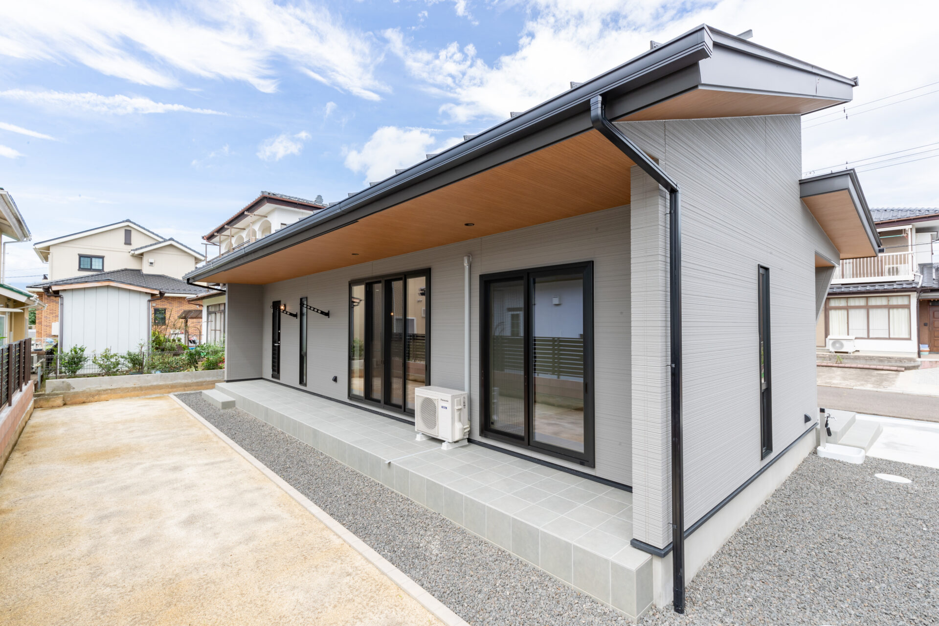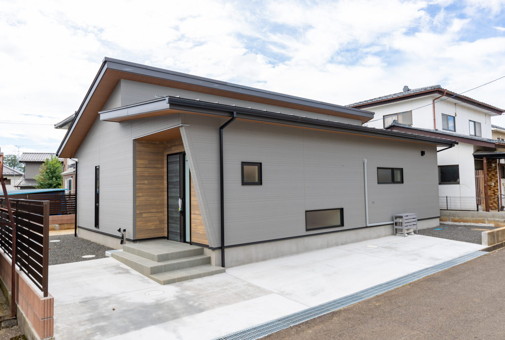 工法は在来軸組み工法。外観は、グレーを基調とした、統一感のある落ち着いたカラーリング。