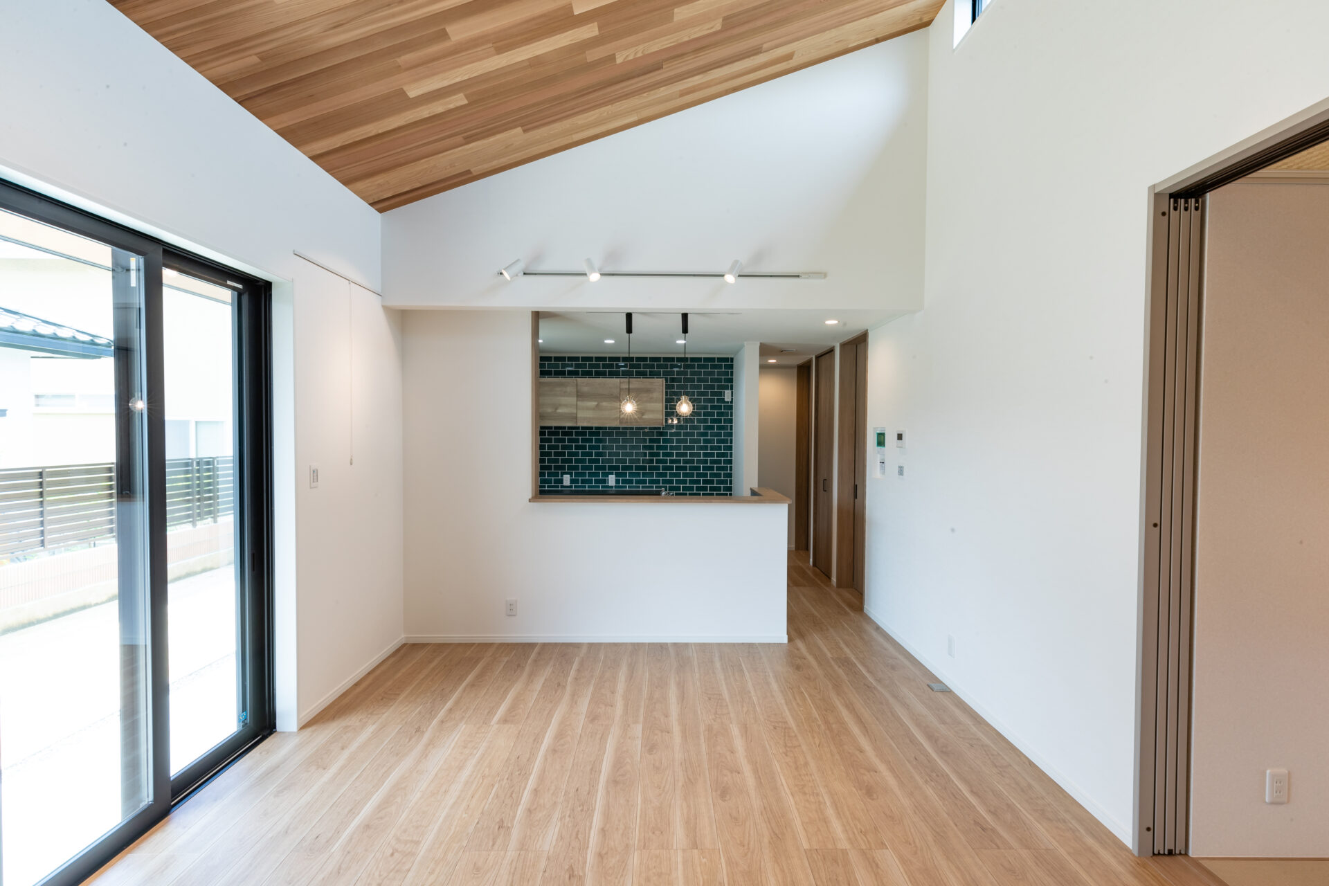 板張りの勾配天井と採光窓で、明るいリビングになっています。