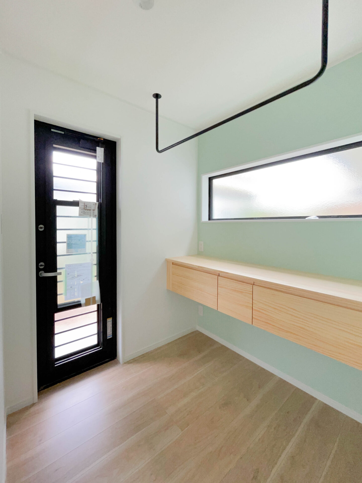 次にランドリールームです。作業台や物干しバーが設置されています。