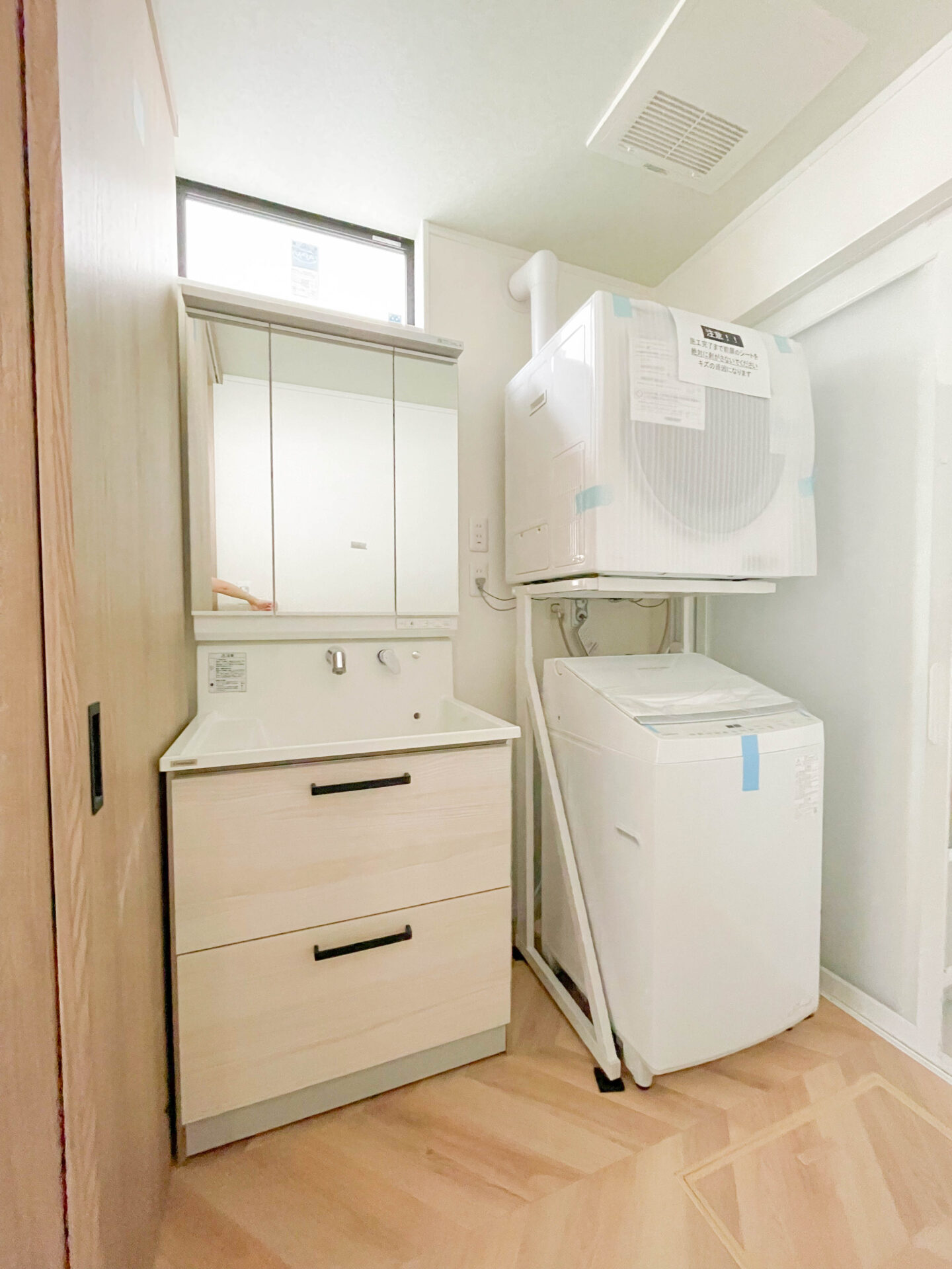 洗面化粧台の上部に明かり窓があり、暗くなりがちな部屋の明るさを確保ています。